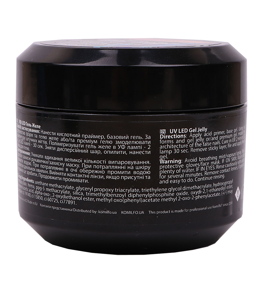 - Komilfo Gel Jelly – гель з унікальною консистенцією желе, яка не тече, при цьому легко вирівнюється пензлем і створює ідеальну архітектуру нігтя з мінімальним обпилюванням.