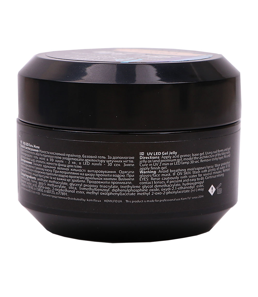 - Komilfo Gel Jelly – гель з унікальною консистенцією желе, яка не тече, при цьому легко вирівнюється пензлем і створює ідеальну архітектуру нігтя з мінімальним обпилюванням.