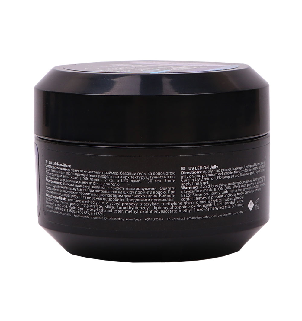 - Komilfo Gel Jelly – гель з унікальною консистенцією желе, яка не тече, при цьому легко вирівнюється пензлем і створює ідеальну архітектуру нігтя з мінімальним обпилюванням.