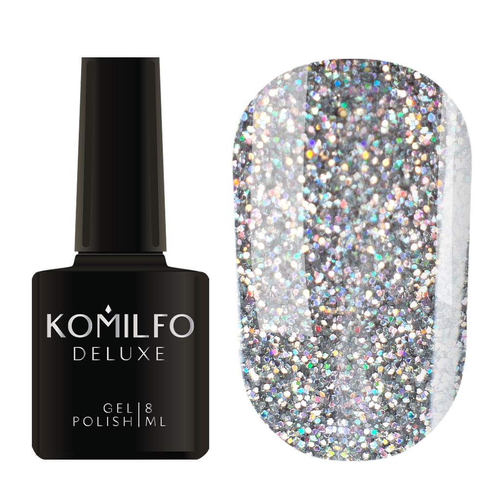 Гель-лак Komilfo DeLuxe Series G007 дрібні насичені сріблясто-голографічні блискітки, 8 мл