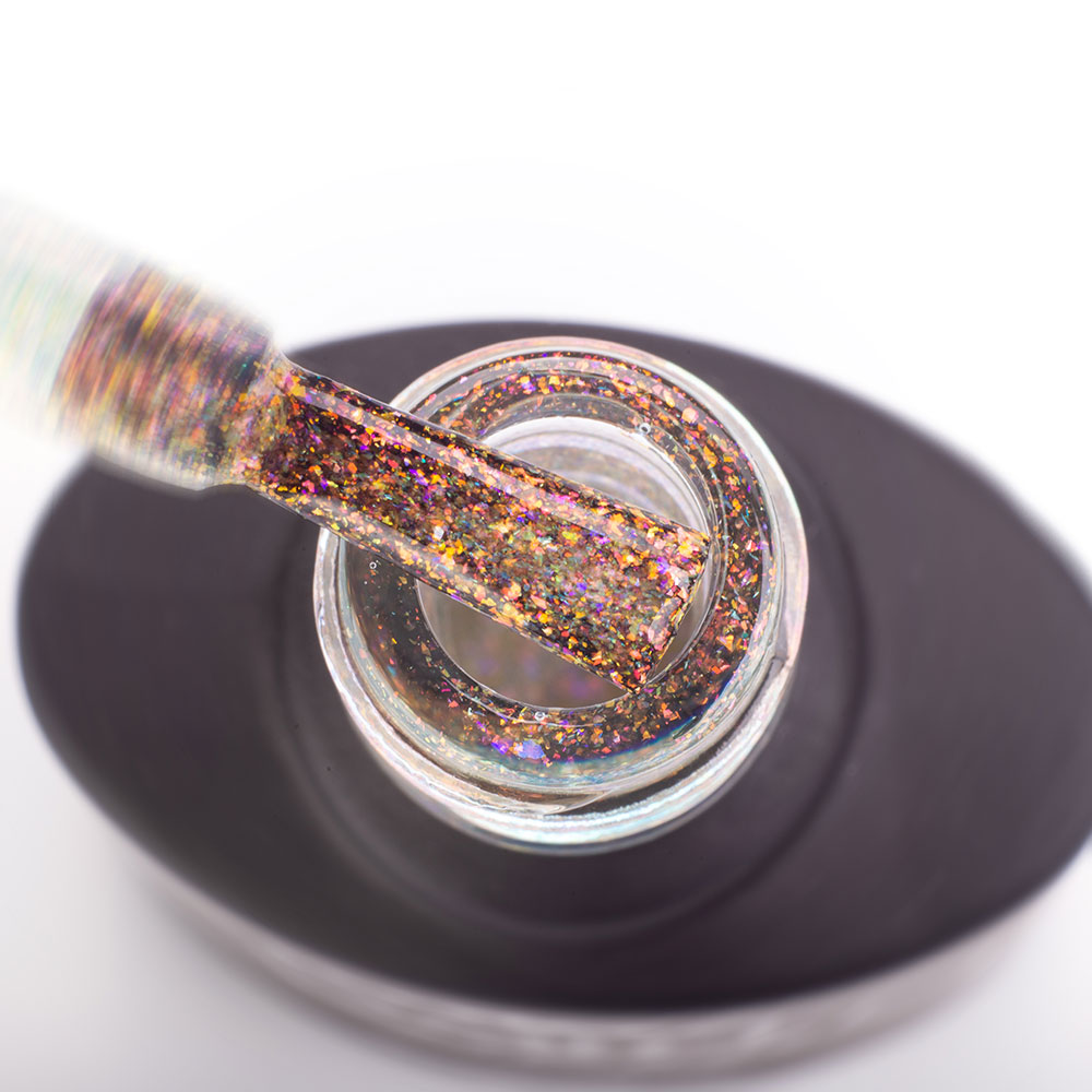 Гель-лак Komilfo DeLuxe Series G013 прозорий опал з голографічним мікроблиском золотистий на чорній підкладці, 8 мл