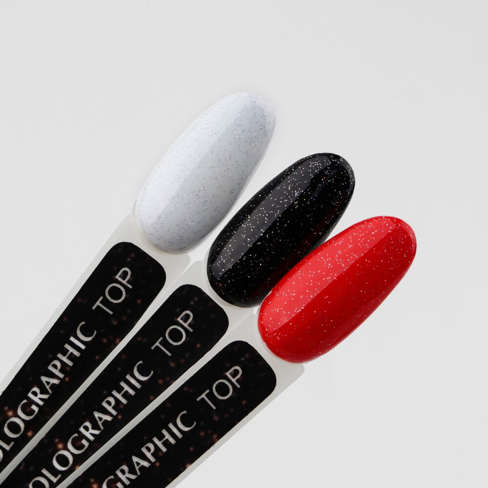 - Новий голографічний топ це зібрання мільйонів блискучих частинок всілякими кольорами! Топ відмінно лягає на нігтьову пластину, дивовижно виглядає на будь-яких відтінках від світлих до темних. Дуже красиво грає на сонці та підходить до будь-якого дизайну.