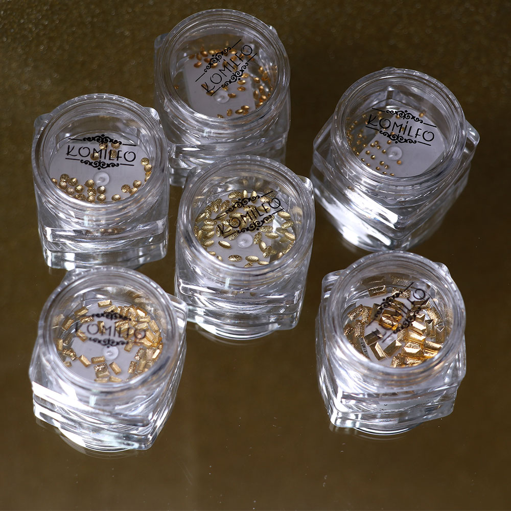 Металеві текстурні заклепки Komilfo — це виразний елемент декору для створення унікального 3D-манікюру. Представлені в золотому та сріблястому кольорах, заклепки різних форм ідеально доповнять як класичні, так і креативні дизайни.