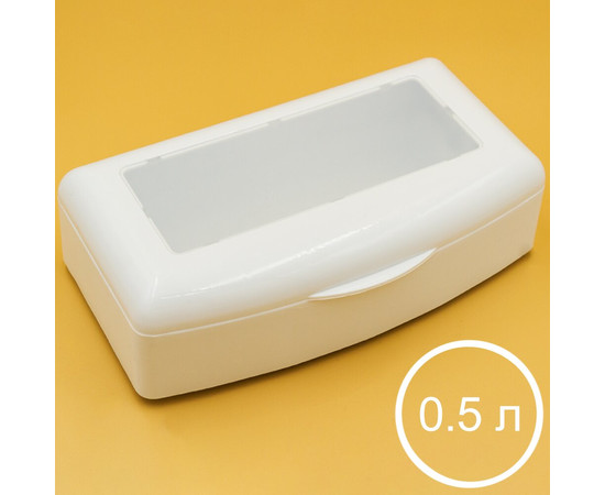 Даний прямокутний контейнер для дезінфекції відрізняється від подібних виробів підвищеної ємністю - 0.5 л. Стінки ємності відокремлені від зовнішніх пустотним прошарком, який виконує функцію найпростішого термоса (тут немає відбиваючих покриттів, але шар повітря зменшує теплопередачу). Кришка не знімається, відкидається назад і фіксується тримачами. Лоток для інструменту має розміри 80 на 190 мм і повторює форму ємності. Кришка не цільна - внутрішня частина виконана з напівпрозорого оргскла.