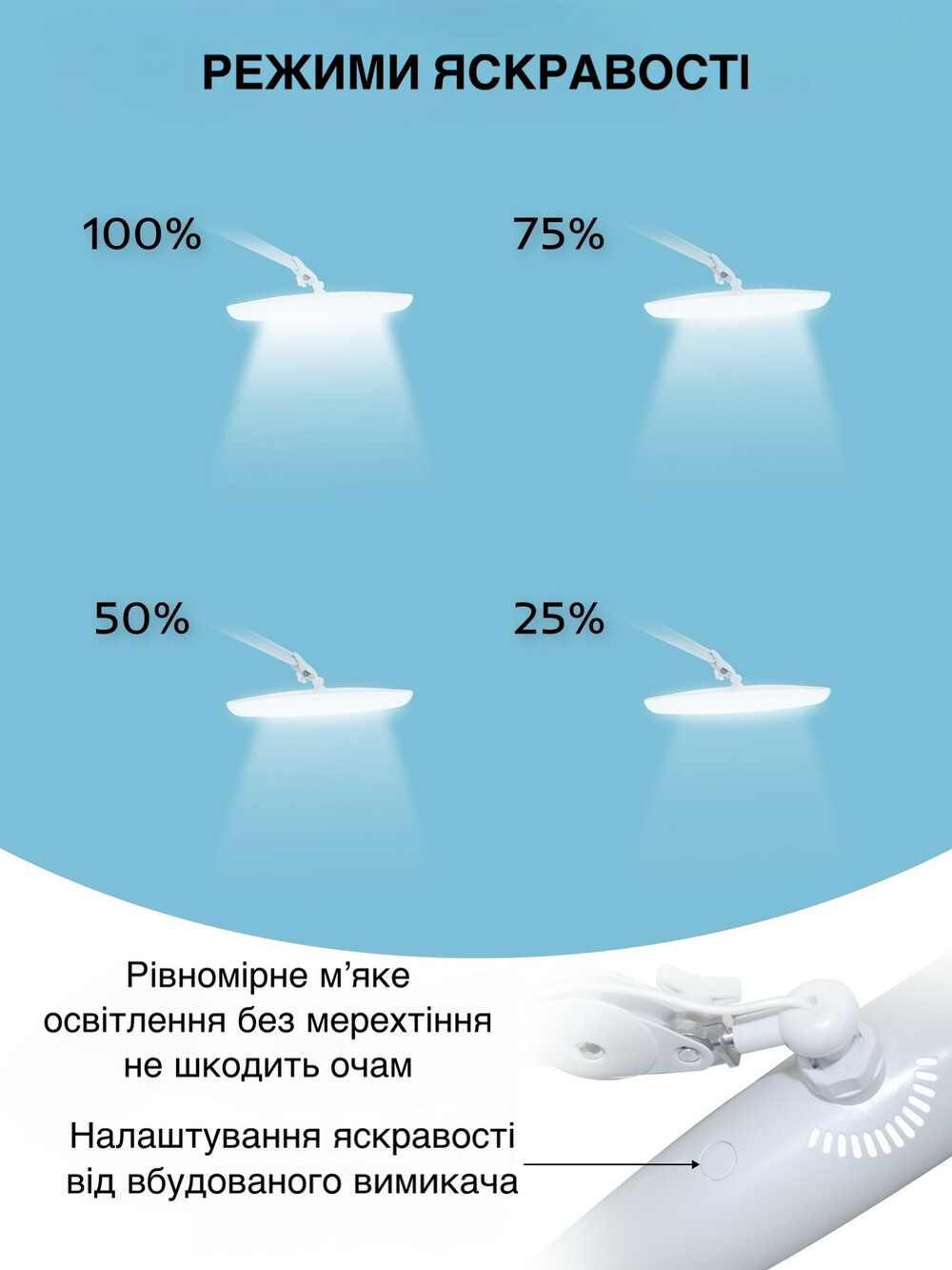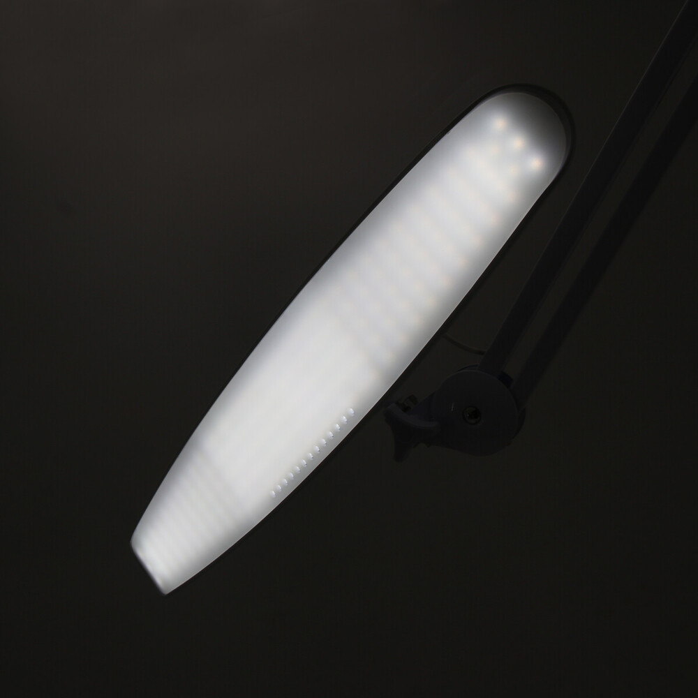 Штатив лампи кріпиться за допомогою струбцини до будь-якої плоскої поверхні, що робить її універсальною для використання на різних робочих столах.