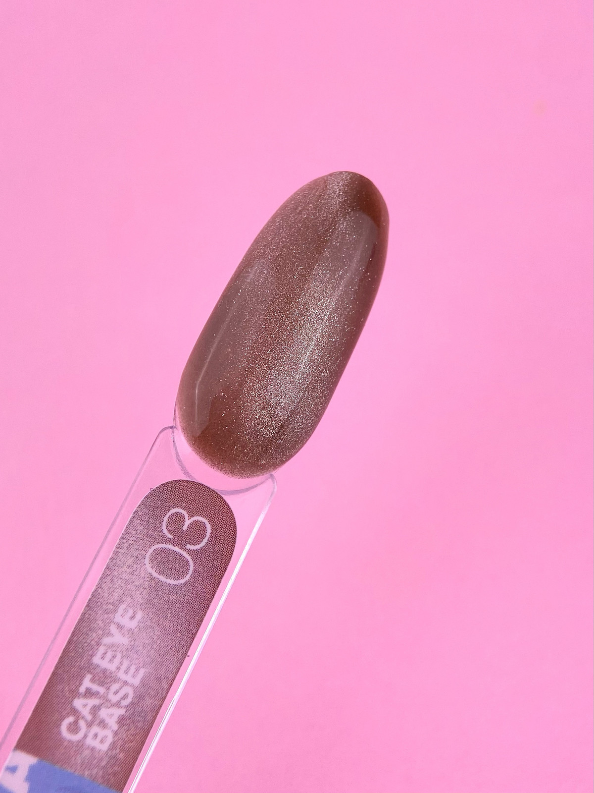 Cat Eye base №3 — це база з ефектом котяче око. У складі продукту є наявні маленькі металеві частинки, які реагують на дію магніту, переміщаючись в ще не заполімеризованому шарі покриття, які забезпечують в результаті дизайн з чарівним відблиском.