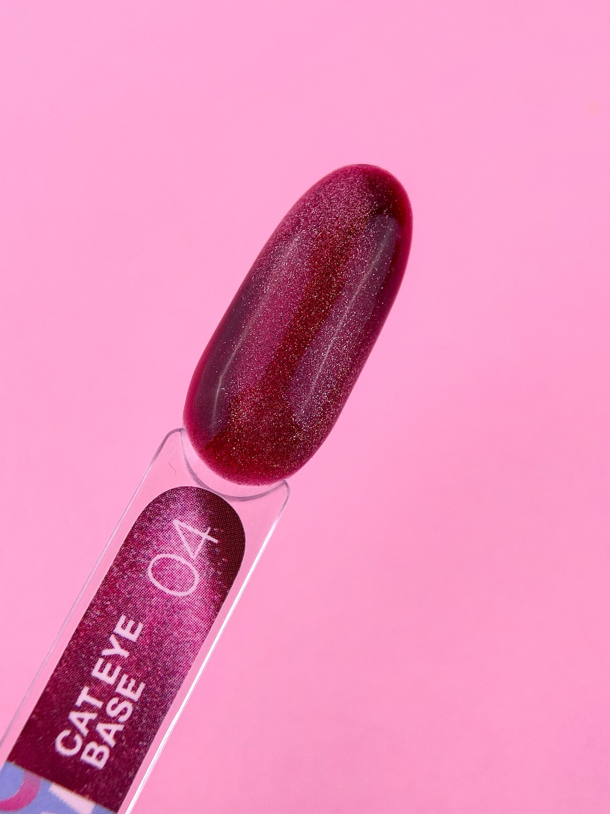 Cat Eye base №4 — це база з ефектом котяче око. У складі продукту є наявні маленькі металеві частинки, які реагують на дію магніту, переміщаючись в ще не заполімеризованому шарі покриття, які забезпечують в результаті дизайн з чарівним відблиском.