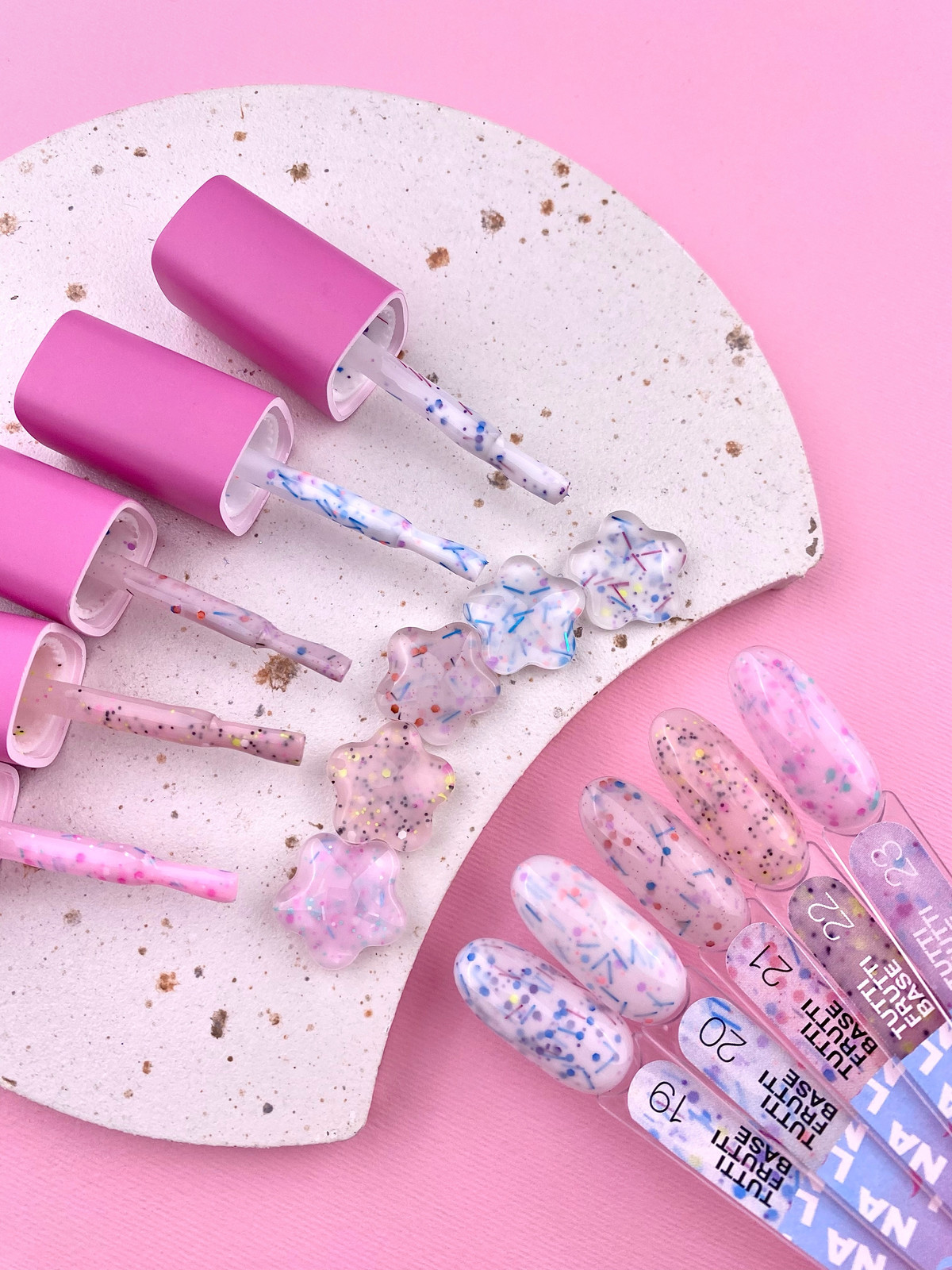Tutti Frutti Base 20 — це камуфлююча база з кольоровими фігурками для покриття та вирівнювання нігтів.