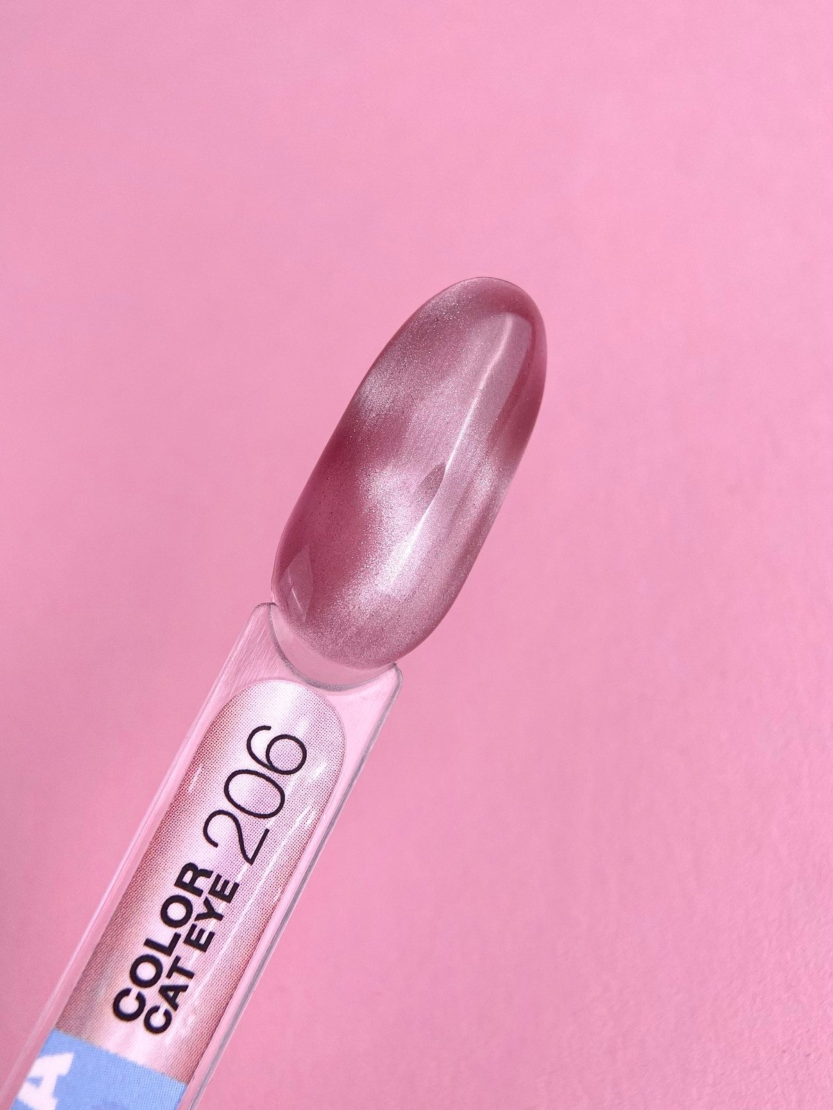 Color Cat Eye №206 - напівпрозорий гель-лак, який лягає як в один, так і два тонких шари. Не лягає смугами при нанесенні та легко самовирівнюється. Має середньо-густу консистенцію. У складі продукту є наявні маленькі металеві частинки, які реагують на дію магніту, переміщаючись в ще не заполімеризованому шарі покриття, які забезпечують в результаті дизайн з чарівним відблиском. Гель-лак Lunamoon має стійке покриття, не тріскається, не скочується, забезпечує нанесення з легкістю та задоволенням.