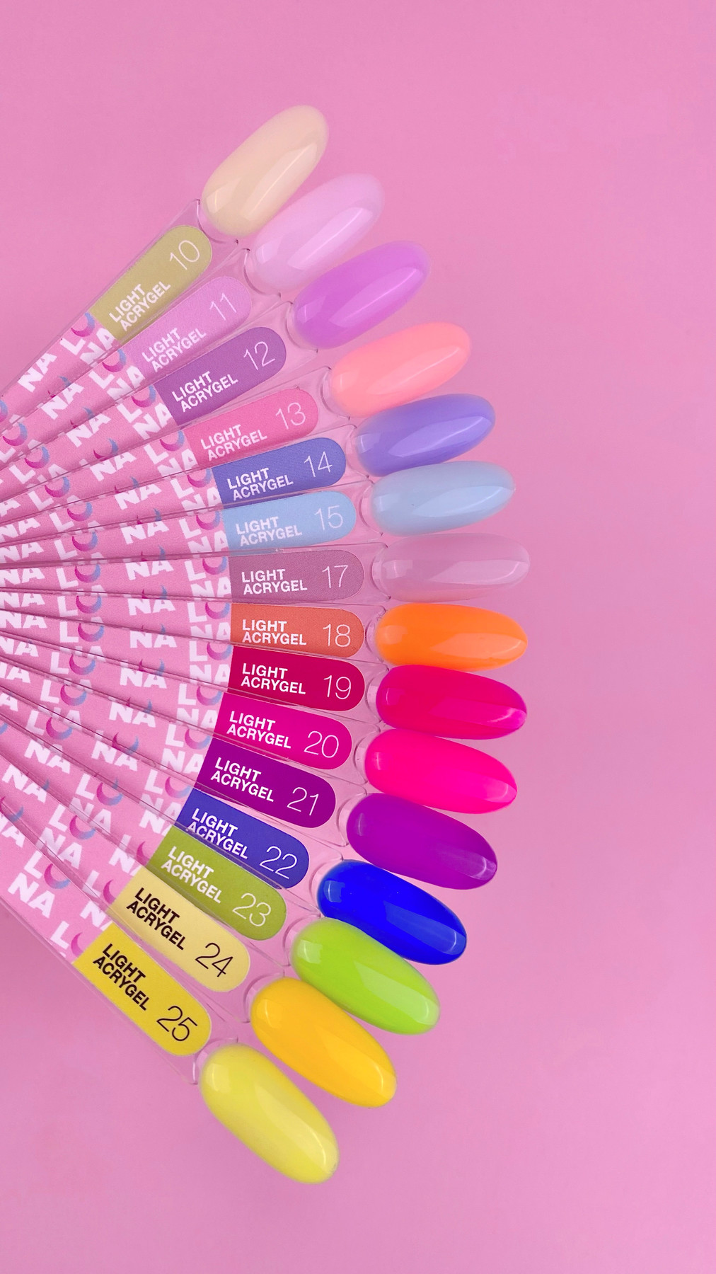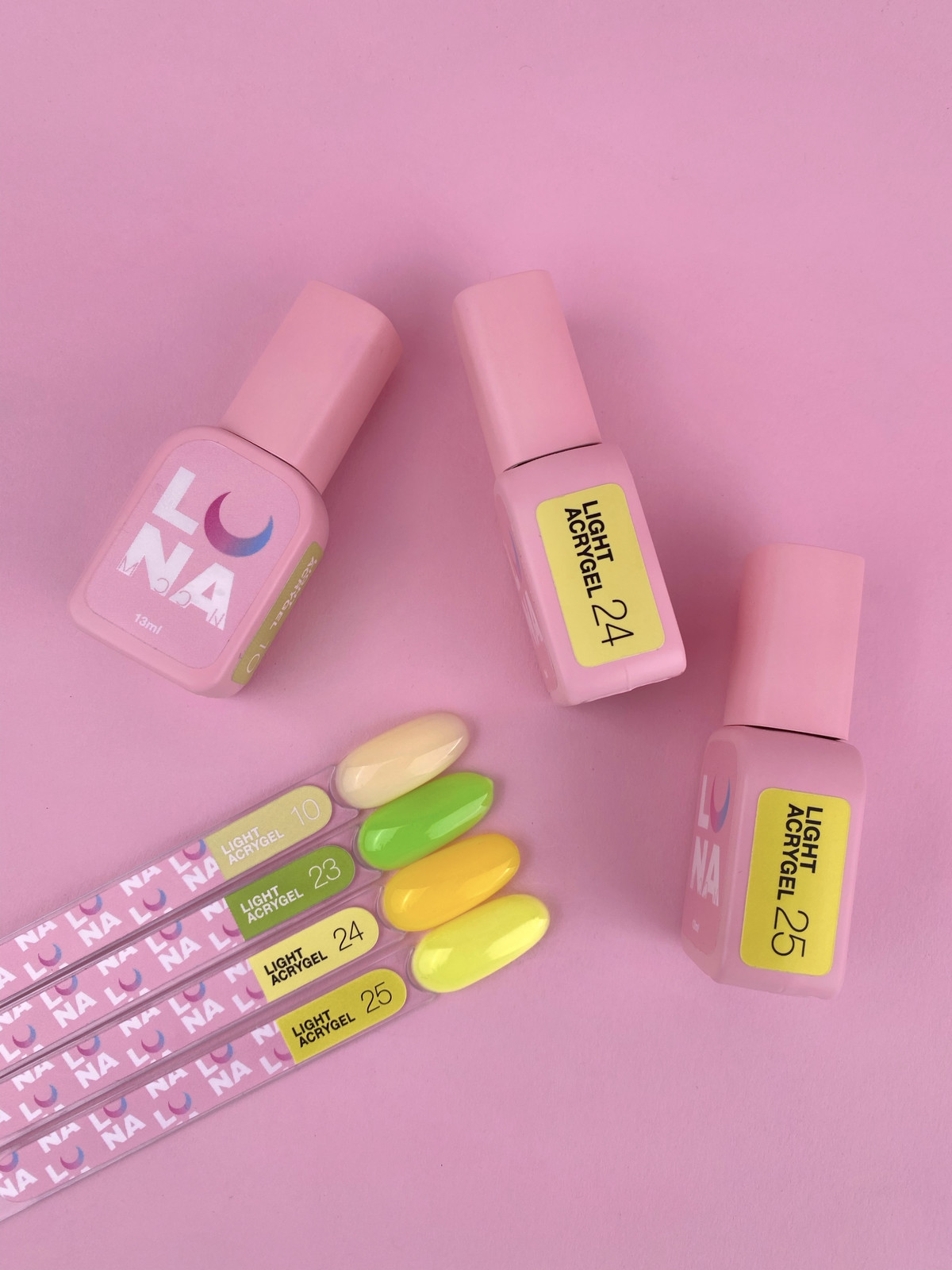 Light Аcrygel - симбіоз полігеля та бази. Він складається більш ніж на половину (60-80%) з акрилового кополімеру, основний компонент полігеля, та невеликої кількості гідроксиетилметакрилату НЕМА (близько 20-30%), основного компонента базових покриттів. Він може повністю замінити бази.