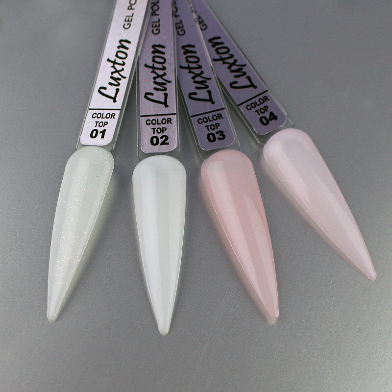 LUXTON Top Color - лінійка топів з кольоровим ефектом, що камуфлює. Ці фінішні нейл-покриття не мають липкого шару і здатні забезпечити манікюру не тільки ефектний блиск глянсовий, але і особливий відтінковий шарм. Не каламутніють, не жовтіють, зберігають початкову яскравість, глибину та насиченість кольору до зняття. Виробник позиціонує цю лінійку як справжній бестселер. Топи надійні, практичні у використанні, рівномірно лягають на ніготь, не розтікаються, не стягуються, повноцінно полімеризуються.