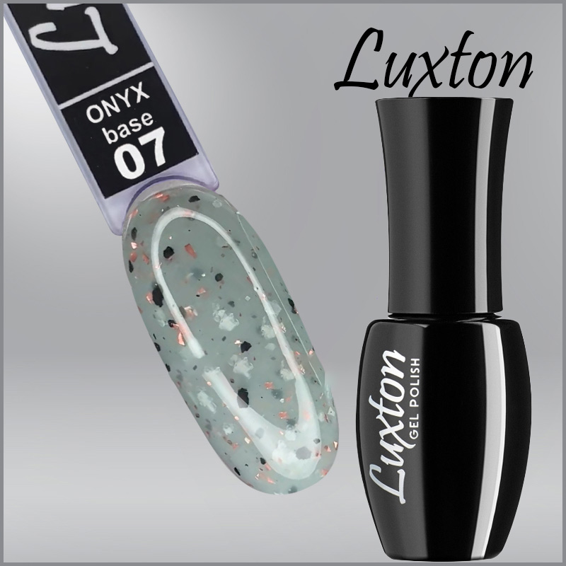 Камуфлююча база LUXTON Onyx Base 7, світла сіра з чорними пластівцями і персиковою поталлю, 10мл - неймовірна, розкішна, база з поталлю стане запорукою гарного, стійкого манікюру, який радуватиме його власницю довгий час, не втрачаючи естетичної привабливості, надаючи доглянутості жіночим рукам. В'язкий, густий матеріал без проблем розподіляється по нігтьовій пластині, не допускаючи прогалин, пропусків, вирівнює її поверхню, приховує невеликі дефекти, пігментні та інші плями на нігті, непривабливі відтінки. Рівномірне нанесення тонкого шару покриття дозволяє виконувати маленький пензлик, зручної форми, а стильний флакон з логотипом компанії має оптимальний об'єм, забезпечуючи комфортність у нанесенні професійного засобу.