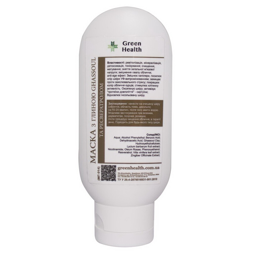 Маска для обличчя з глиною Ghassoul і ресвератролом Green Health МГ-014, 250 мл