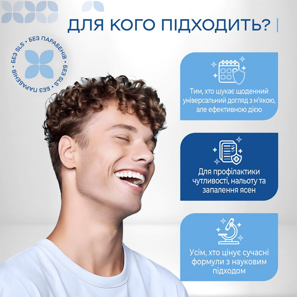 Ополіскувач сприяє тривалому відчуттю чистоти протягом дня та піклується про здоров'я порожнини рота. Ксилитол і цинковий лактат діють у комплексі, запобігаючи утворенню нальоту та карієсу, мають антимікробну дію. Гіалуронова кислота у складі підтримує процеси відновлення тканин слизової оболонки, а комплекс Yogurtene® Balance піклується про баланс мікрофлори порожнини рота та зміцнення захисного бар'єру.