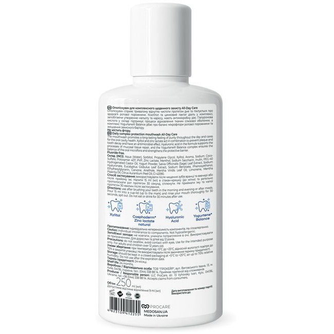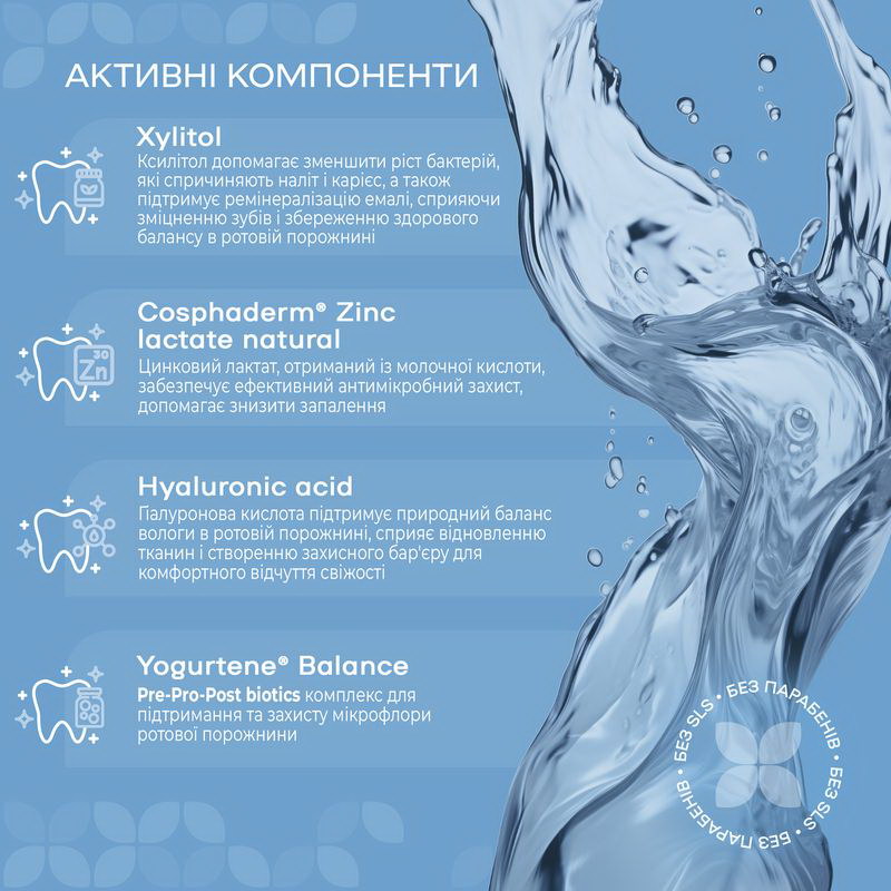 Ополіскувач сприяє тривалому відчуттю чистоти протягом дня та піклується про здоров'я порожнини рота. Ксилитол і цинковий лактат діють у комплексі, запобігаючи утворенню нальоту та карієсу, мають антимікробну дію. Гіалуронова кислота у складі підтримує процеси відновлення тканин слизової оболонки, а комплекс Yogurtene® Balance піклується про баланс мікрофлори порожнини рота та зміцнення захисного бар'єру.