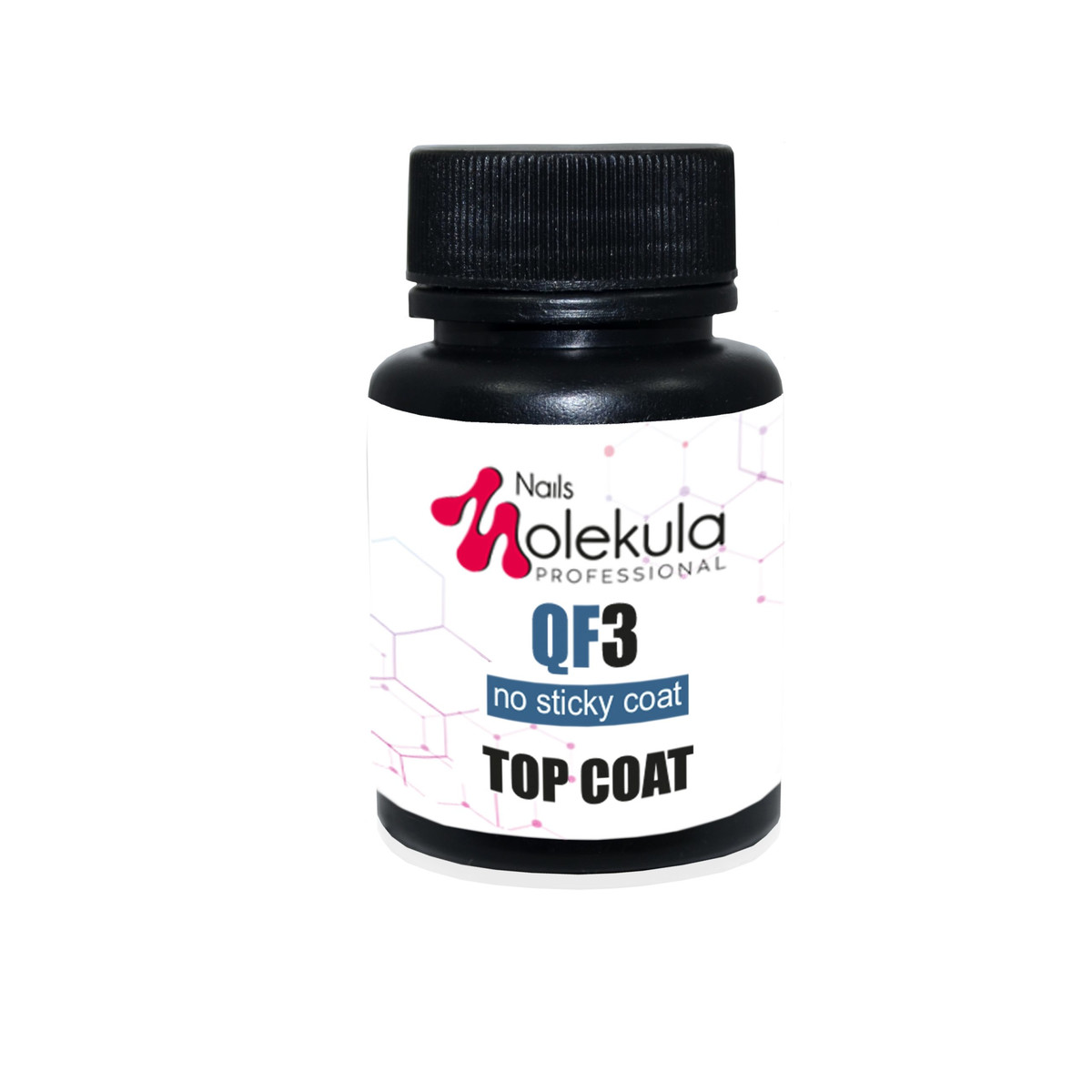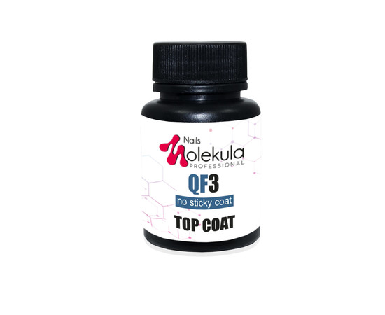 Molekula QF 3 Top Coat - фінішне покриття, яке завдяки спеціальній формулі надає манікюру неперевершеного глянсового блиску. Захищає покриття від сколів та подряпин, підкреслює насиченість та глибину кольору. Швидко сохне, а також ідеально самовирівнюється. Достатньо нанесення одного шару верхнього покриття на штучний ніготь. Використовувати лише для робіт із гелем. Засіб без дисперсійного (липкого) шару. Консистенція – середньої в'язкості.