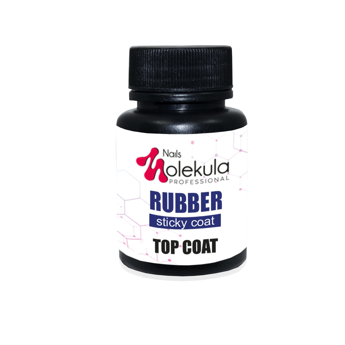 Molekula Rubber Sticky Top Coat – завершальне покриття для штучних та натуральних нігтів. Запобігає сколам і подряпинам нігтів. Підкреслює блиск та яскравість кольору гель-лаку. Наноситься дуже тонким шаром. Підходить для перекриття будь-яких дизайнів. Легкий та зручний у роботі. Засіб має дисперсійний (липкий) шар. Консистенція – середньої в'язкості.