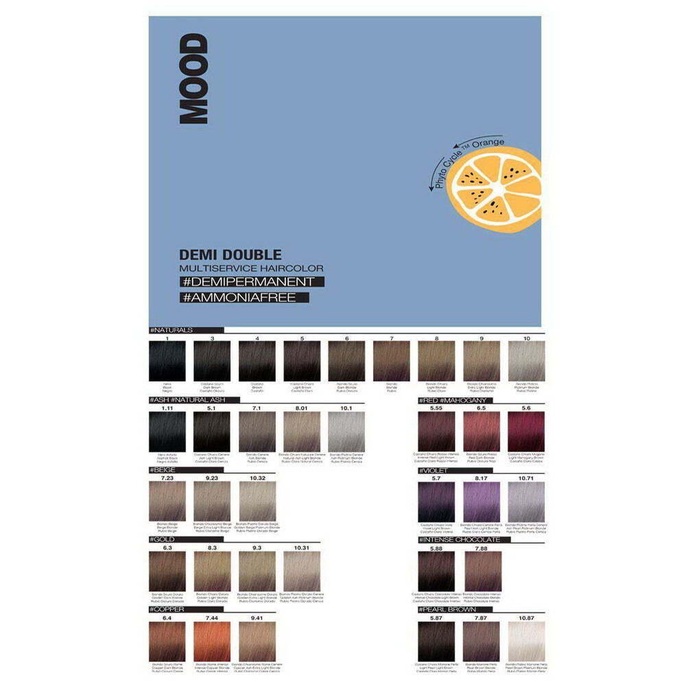 Інноваційна мультифункціональна фарба для волосся від бренда Mood призначена для стійкого та перманентного фарбування, а також для тонування. Вона не містить аміаку, тому дуже делікатно впливає на локони. Засіб збагачений технологією Phyto Cycle Orange, яка сприяє згладжуванню розпушених волосяних лусочок, робить пасма слухняними, шовковистими та блискучими.