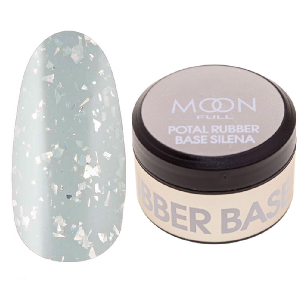 Кольорова, каучукова база із поталлю Moon Full Silena Rubber Base вирівнює нігтьову пластину та одночасно покриває нігті кольором.