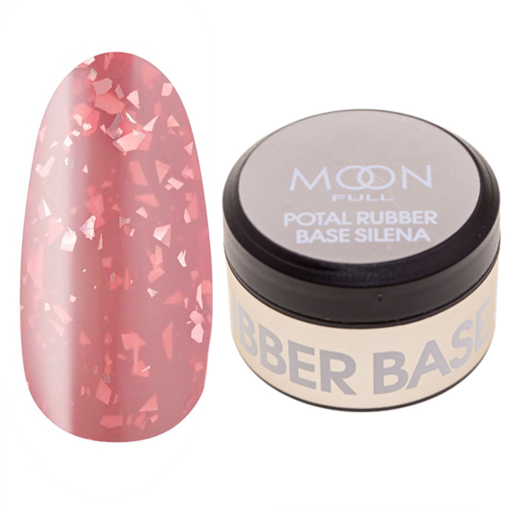 Кольорова, каучукова база із поталлю Moon Full Silena Rubber Base вирівнює нігтьову пластину та одночасно покриває нігті кольором.