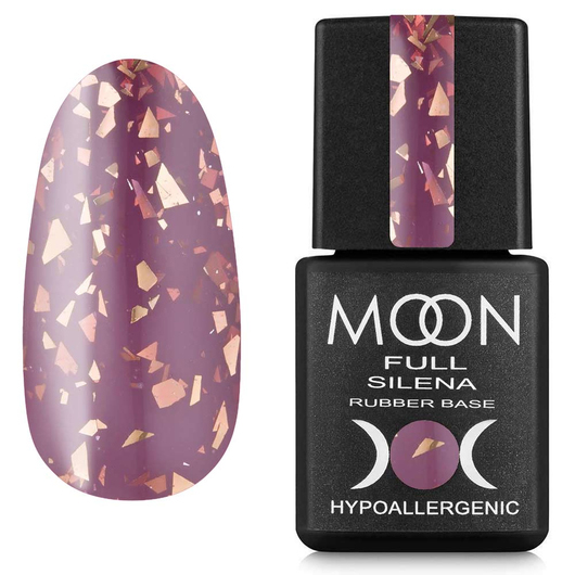 Кольорова, каучукова база із поталлю Moon Full Silena Rubber Base вирівнює нігтьову пластину та одночасно покриває нігті кольором.