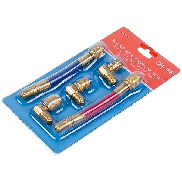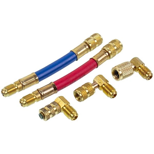 Комплект, який ідеально підходить для доступу до систем кондиціювання автомобілів R-12, а також до інших типів систем. П'ять адаптерів з фітингами 1/4": Два гнучкі адаптери (шланги) 1/4" x 3/16", 1/4" x 1/8 "Три 90? латунні адаптери 1/4" x 1/4", 1 /4" x 3/16", 1/4" x 3/8"