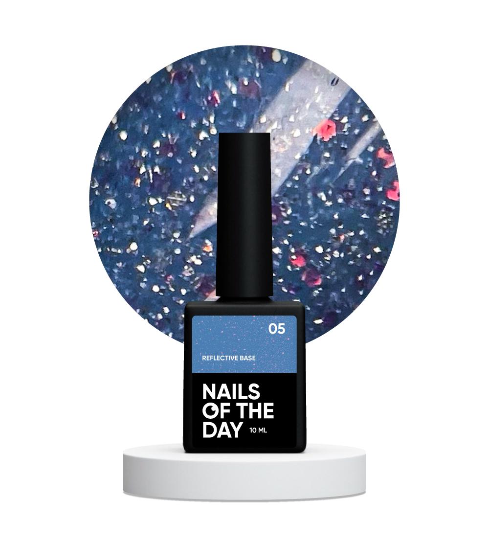 Nails of the Day Reflective base 05 – камуфлююча світловідбиваюча база з голографічними блискітками (насичено-блакитна), 10 мл