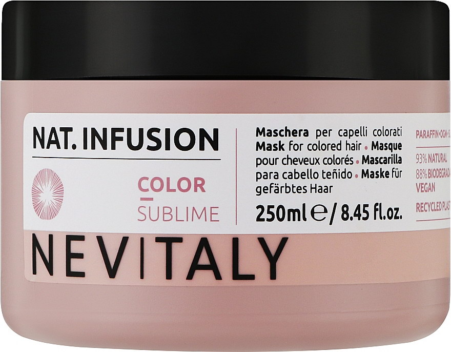 Щоб надовго зберегти глибину і насиченість відтінку фарбованого волосся, використовуйте маску бренду Nevitaly. Завдяки цінним оліям та екстрактам вона забезпечує живлення структури локонів і надає їм гарного вигляду. Засіб запобігає вимиванню кольору, а також захищає його від деструктивного впливу ультрафіолету.