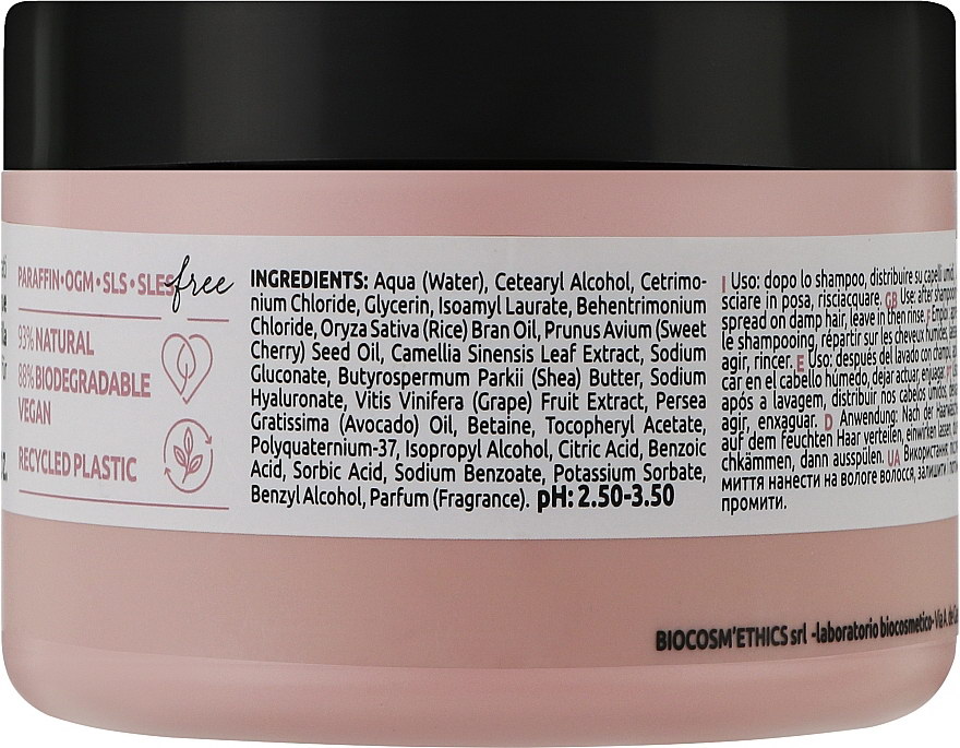 Aqua (Water), Cetearyl Alcohol, Cetrimo- nium Chloride, Glycerin, Isoamyl Laurate, Behentrimonium Chloride, Oryza Sativa (Rice) Bran Oil, Prunus Avium (Sweet Cherry) Seed Oil, Camellia Sinensis Leaf Extract, Sodium Gluconate, Butyrospermum Parkii (Shea) Butter, Sodium Hyaluronate, Vitis Vinifera (Grape) Fruit Extract, Persea Gratissima (Avocado) Oil, Betaine, Tocopheryl Acetate, Polyquaternium-37, Isopropyl Alcohol, Citric Acid, Benzoic Acid, Sorbic Acid, Sodium Benzoate, Potassium Sorbate, Benzyl Alcohol, Parfum (Fragrance).