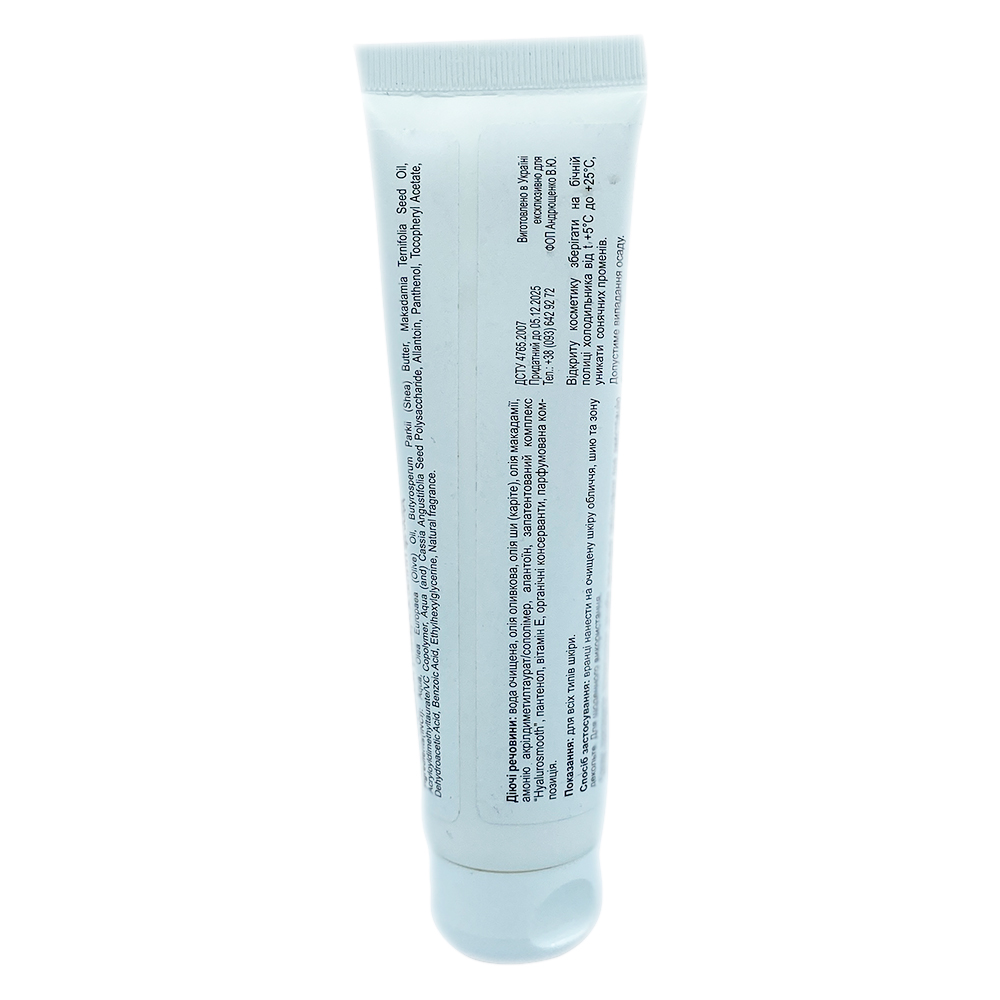 Склад: вода очищена, олія оливок, олія ши (карите), олія макадамії, аммонія акрилоілдіметилтаурат/сополімер, алантоїн, запатентований комплекс hyalurosmooth, пантенол, вітамін Е, органічні консерванти, парфумерна композиція.