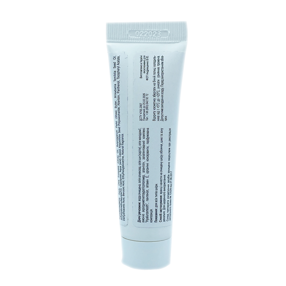 Склад: вода очищена, олія оливок, олія ши (карите), олія макадамії, аммонія акрилоілдіметилтаурат/сополімер, алантоїн, запатентований комплекс hyalurosmooth, пантенол, вітамін Е, органічні консерванти, парфумерна композиція.