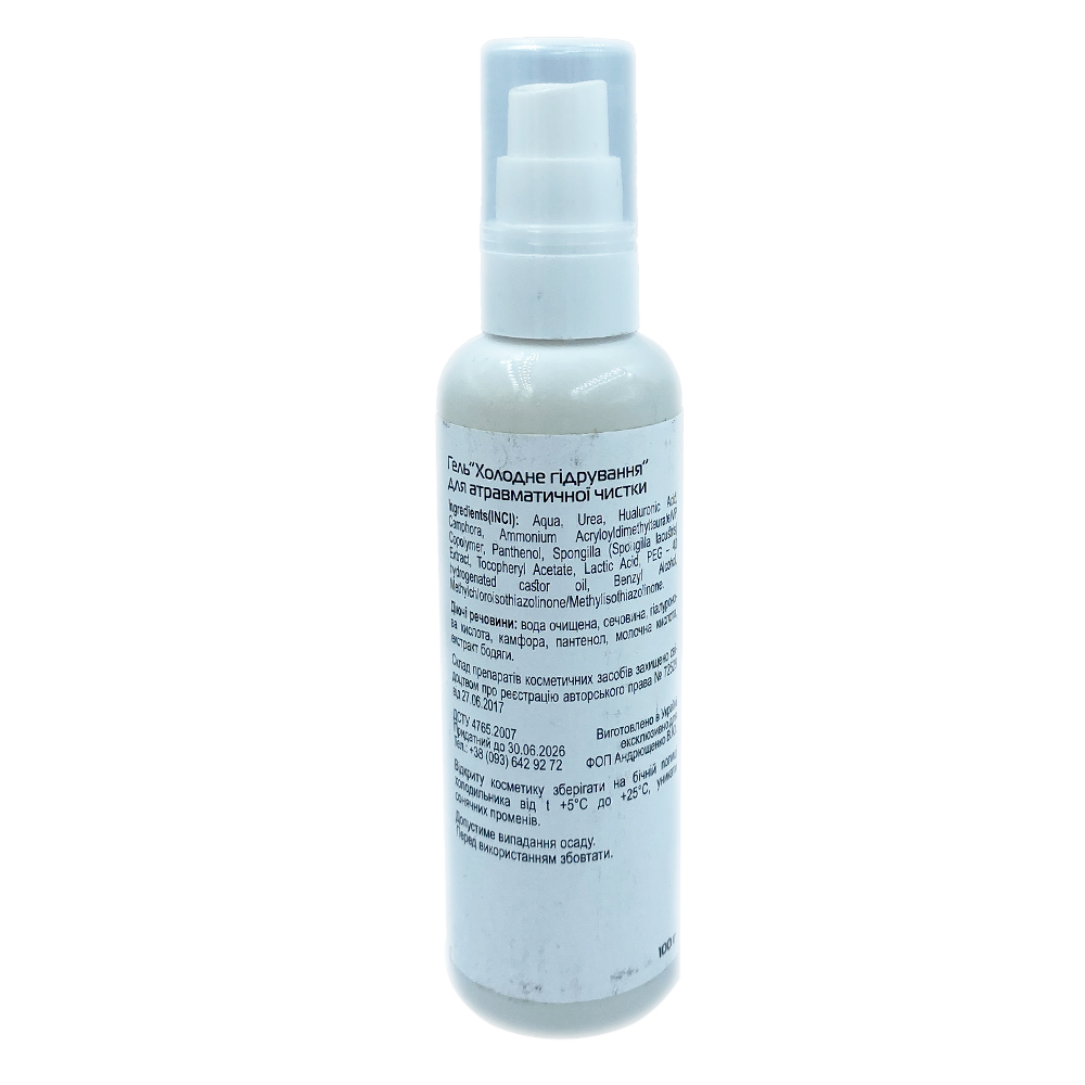 Гель “Холодне гідрування” дає змогу підготувати шкіру до процедури атравматичного чищення, розширює пори, розпушує епідерміс. Дає змогу послабити міжклітинні зв’язки для кращого виведення забруднень, а також зробити пасивний пілінг. Шкіра очищається від старих сухих кератинових клітин і продуктів розпаду, які легко знімаються з поверхні шкіри вологою серветкою.