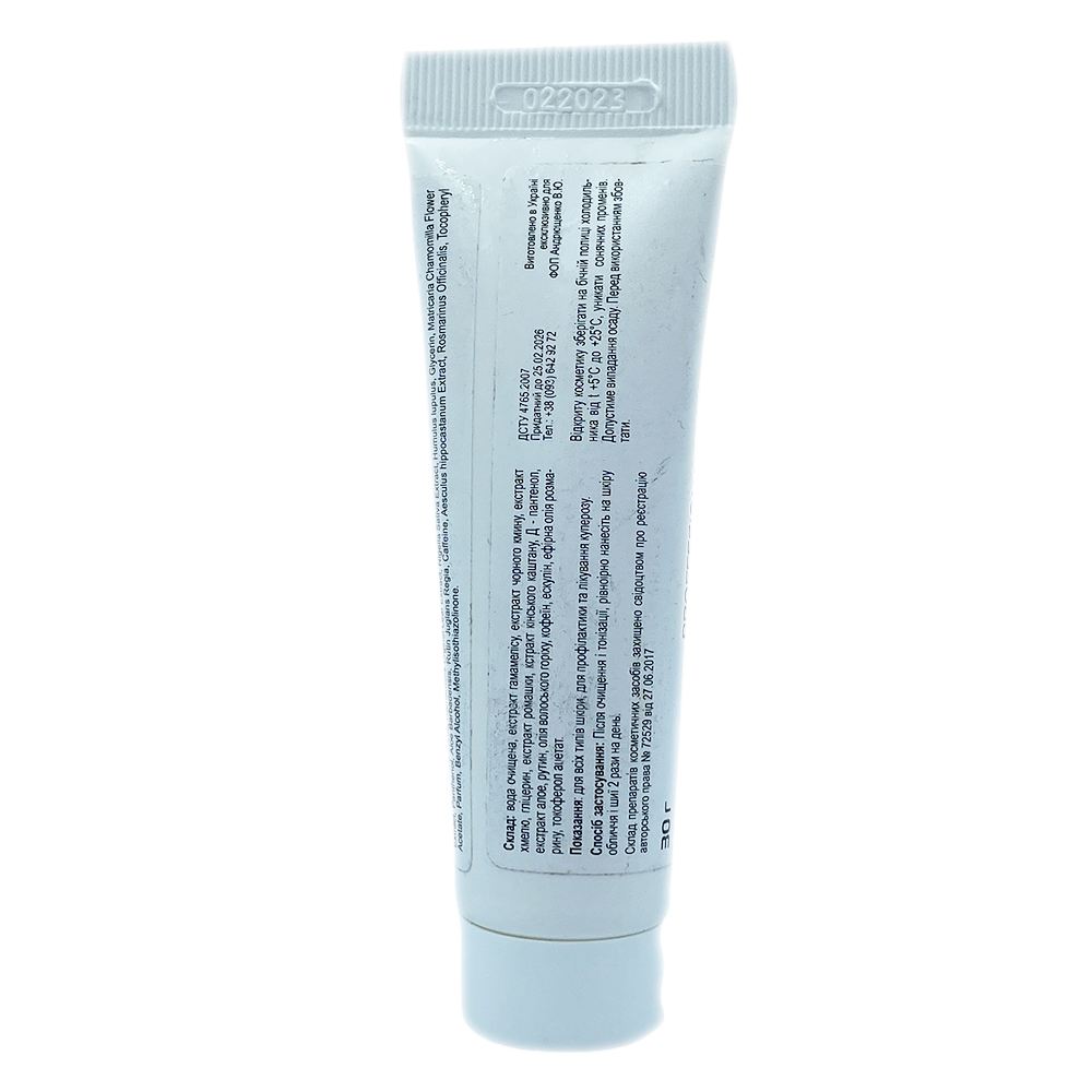 Склад: вода очищена, екстракт гамамелісу, екстракт чорного кмину, екстракт хмелю, гліцерин, екстракт ромашки, екстракт кінського каштану, Д – пантенол, екстракт алое, рутин, олія волоського горіха, кофеїн, ескулін, ефірна олія розмарину, токоферол ацетат.