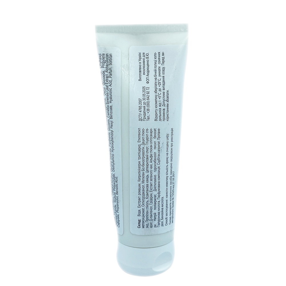 Склад: Вода, Екстракт ромашки, Каприлік/каприк тригліцерид, Етилгексил метоксіцінномат, Октилдодеканол, Метилен Біс-бензотриазолін, Децил глюкозид, Пропілен гліколь, Ксантанова камідь, Цетеариловий спирт, Гліцерил стеарат, Д-пантенол, Гліцерин, Екстракт зеленого чаю, Альфа глюкан, Олігосахариди, Натрій поліакрилат, Діетиламіно гідроксибензоїл гексил бензоат, Гіалуронова кислота, Парфумерна композиція, Сорбітан каприлат, Пропандіол, Бензойна кислота.