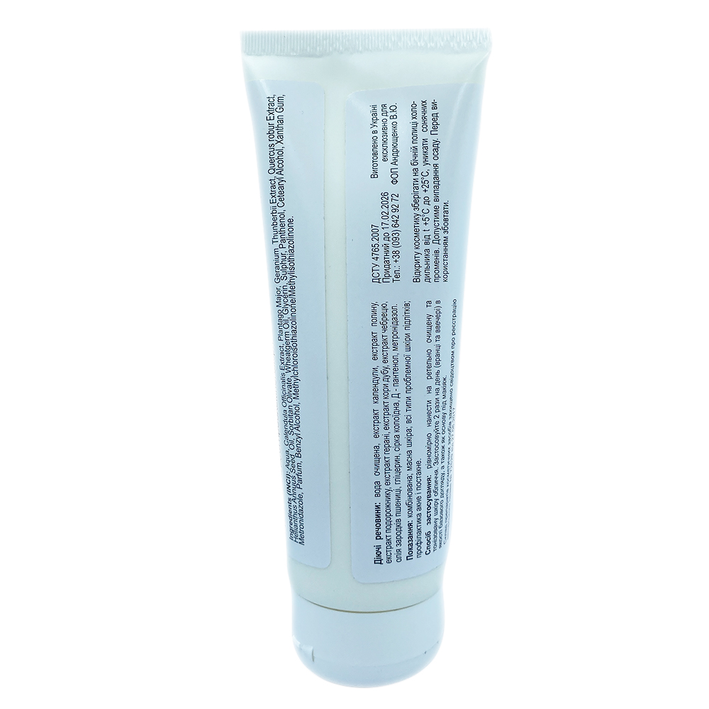 Крем-гель для проблемної шкіри дуже легкий, до його складу входять екстракти календули, полину, кори дуба, чебрецю – завдяки цьому він дуже м’яко справляється із запаленнями шкіри і запобігає подальшому виникненню запалень. Олія зародків пшениці – живить і зволожує шкіру. Шкіра набуває здорового вигляду.