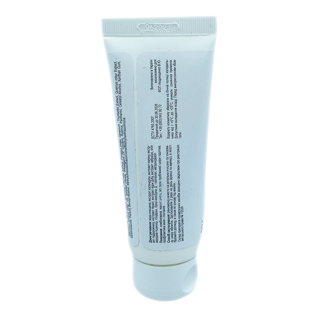Крем-гель для проблемної шкіри дуже легкий, до його складу входять екстракти календули, полину, кори дуба, чебрецю – завдяки цьому він дуже м’яко справляється із запаленнями шкіри і запобігає подальшому виникненню запалень. Олія зародків пшениці – живить і зволожує шкіру. Шкіра набуває здорового вигляду.