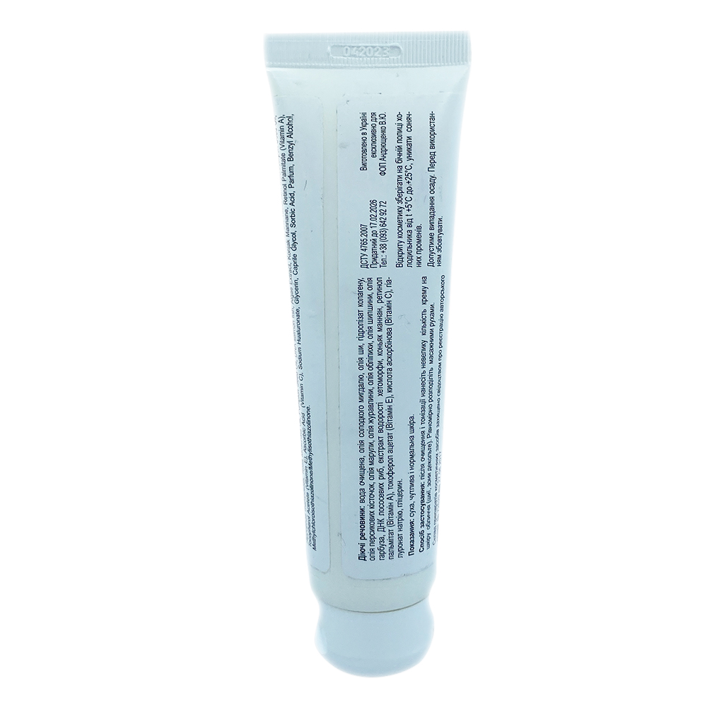 Склад: вода очищена, олія солодкого мигдалю, олія ши, гідролізат колагену, гідролізат колагену, олія персикових кісточок, олія марули, олія журавлини, олія обліпихи, олія шипшини, олія гарбуза, ДНК лососевих риб, екстракт водорості