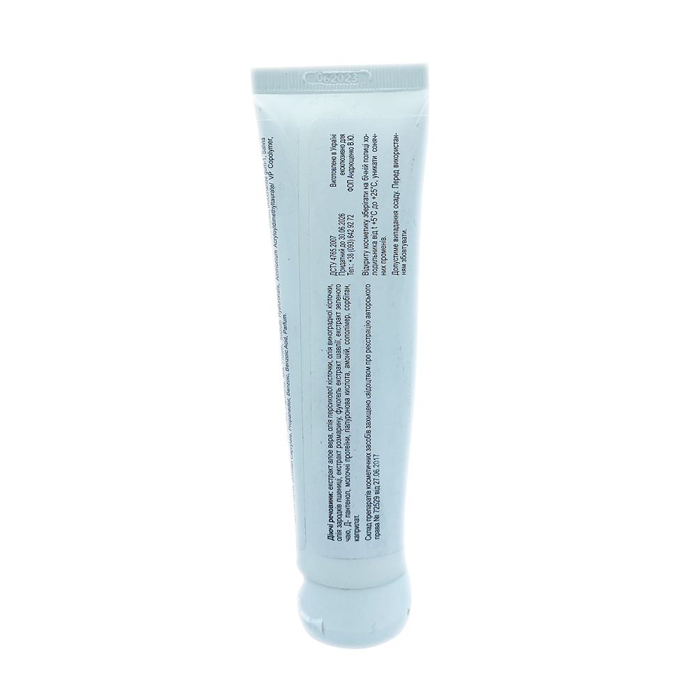 Склад: екстракт алое вера, олія персикових кісточок, олія виноградних кісточок, олія зародків пшениці, екстракт розмарину, фукогель, екстракт шавлії, екстракт зеленого чаю, D – пантенол, молочні протеїни, гіалуронова кислота, амоній сополімер, сорбітол.