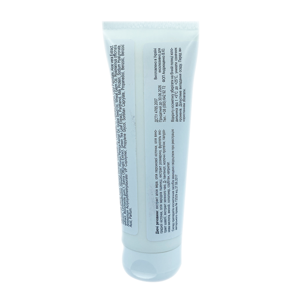 Склад: екстракт алое вера, олія персикових кісточок, олія виноградних кісточок, олія зародків пшениці, екстракт розмарину, фукогель, екстракт шавлії, екстракт зеленого чаю, D – пантенол, молочні протеїни, гіалуронова кислота, амоній сополімер, сорбітол.