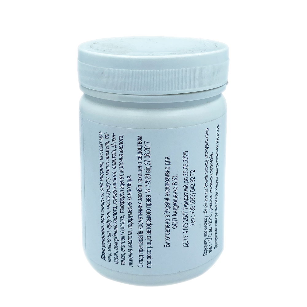 Склад: вода очищена, олія мигдалю, екстракт мучниці, арбутин, олія кунжуту, гліцерин, аскорбінова кислота, олія ши, арбутин, олія кунжуту, олія примули, гліцерин, аскорбінова кислота, коєва кислота, алантоїн, Д-пантенол, екстракт солодки,
