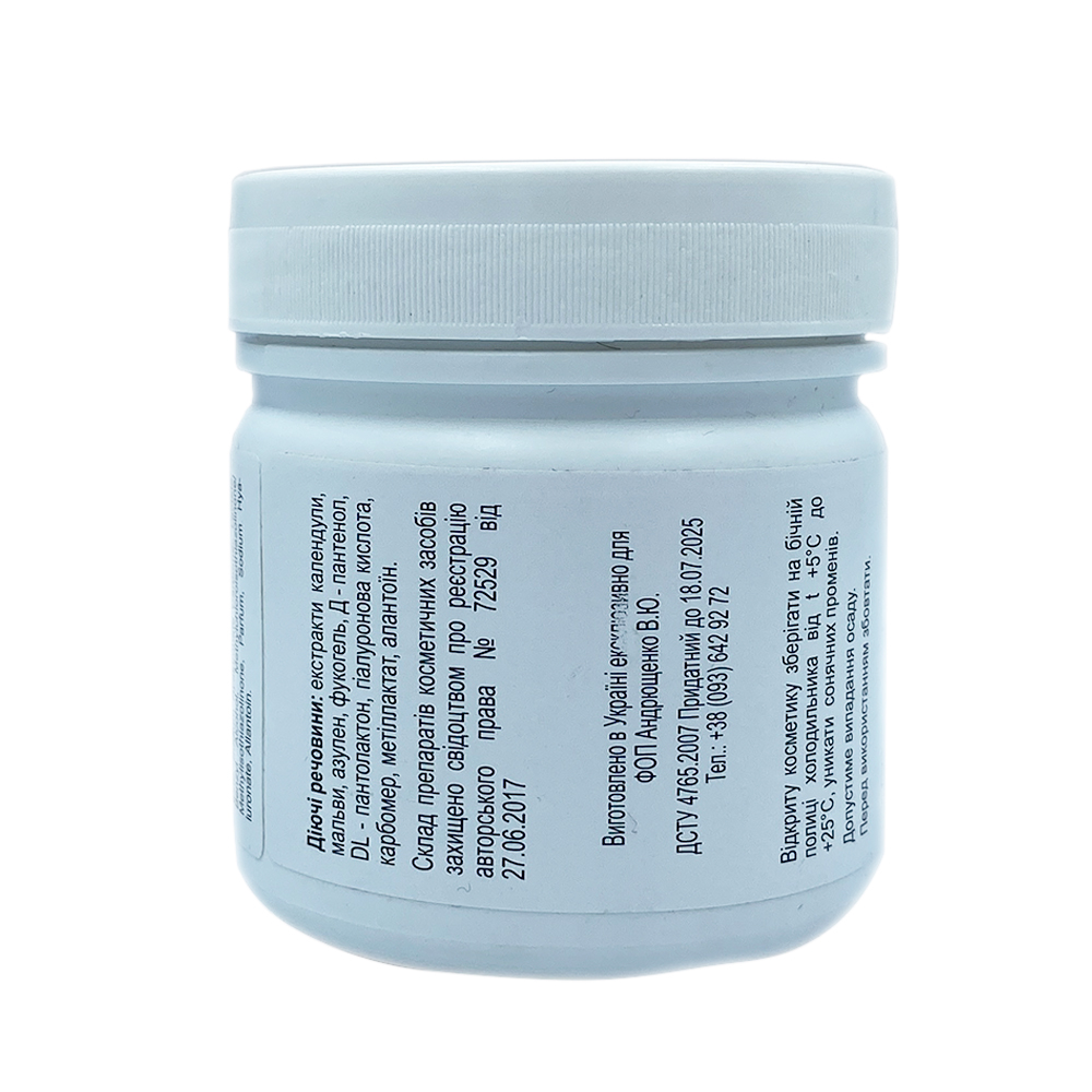 Склад: екстракт календули, мальви, азулен, фукогель, Д-пантенол, DL-пантенол, DL-пантенолактон, гіалуронова кислота, карбомер, ментиллактат, алантоїн.