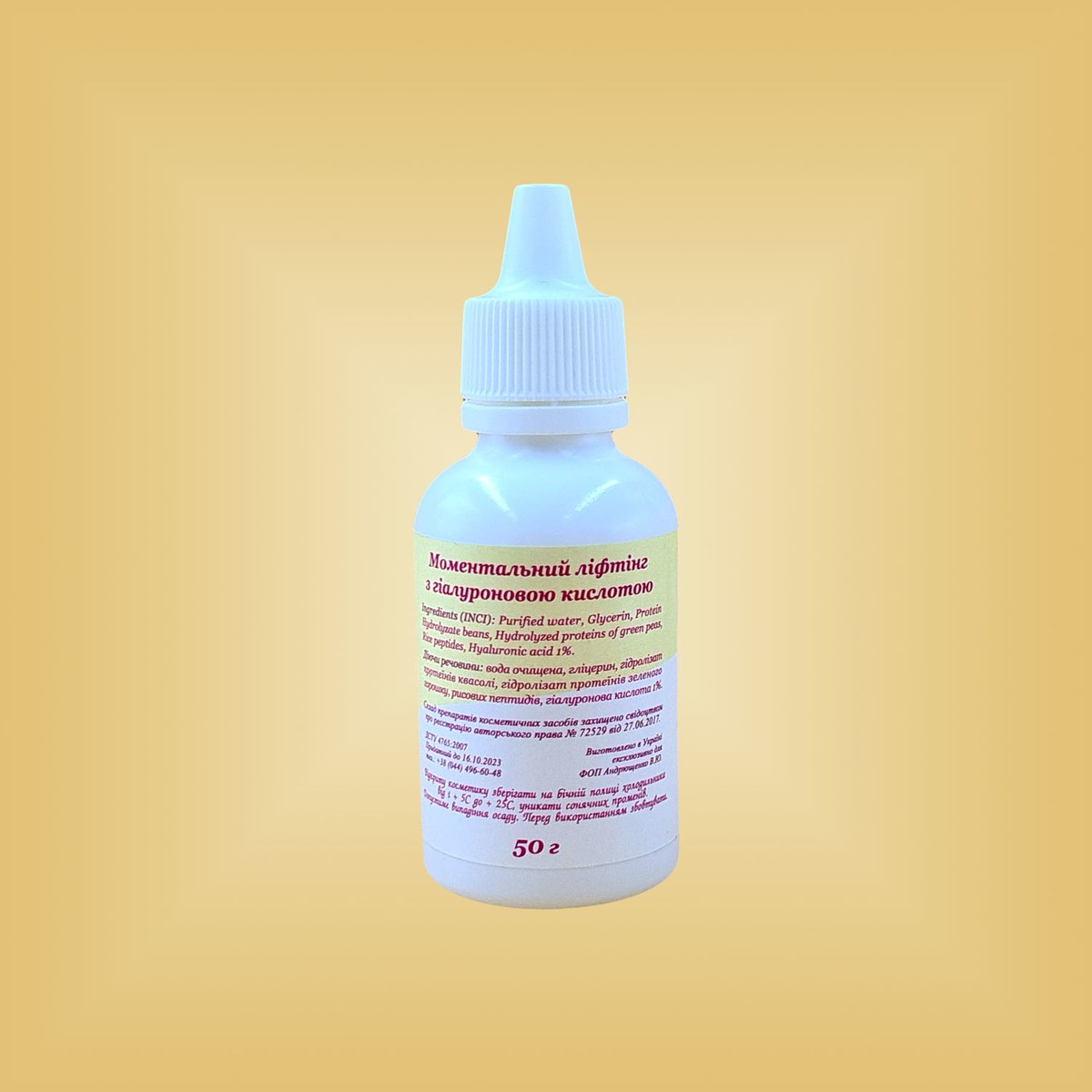 квасолі, гідролізат протеїнів зеленого горошку, рисові пептиди, гіалуронова кислота 1,5%.