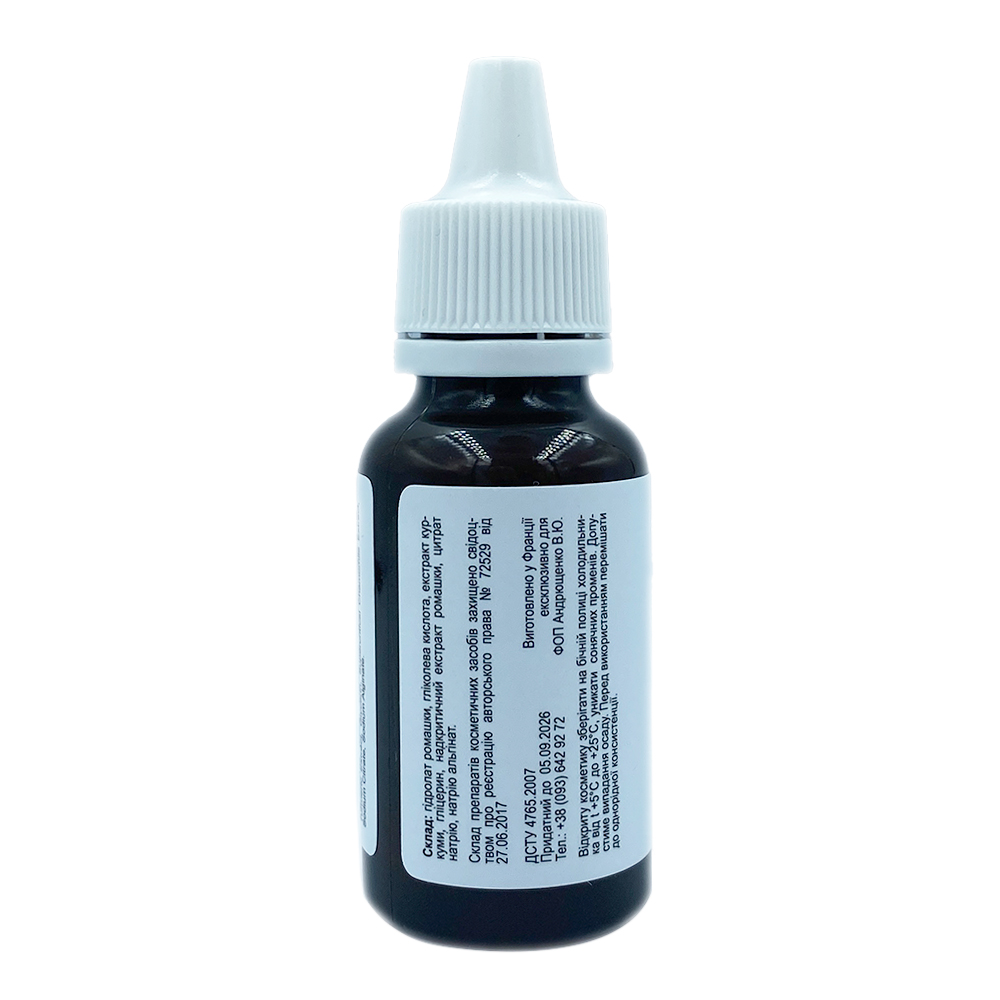 Склад: гідролат ромашки, гліколева кислота, екстракт куркуми, гліцерин, надкритичний CO2 екстракт ромашки,