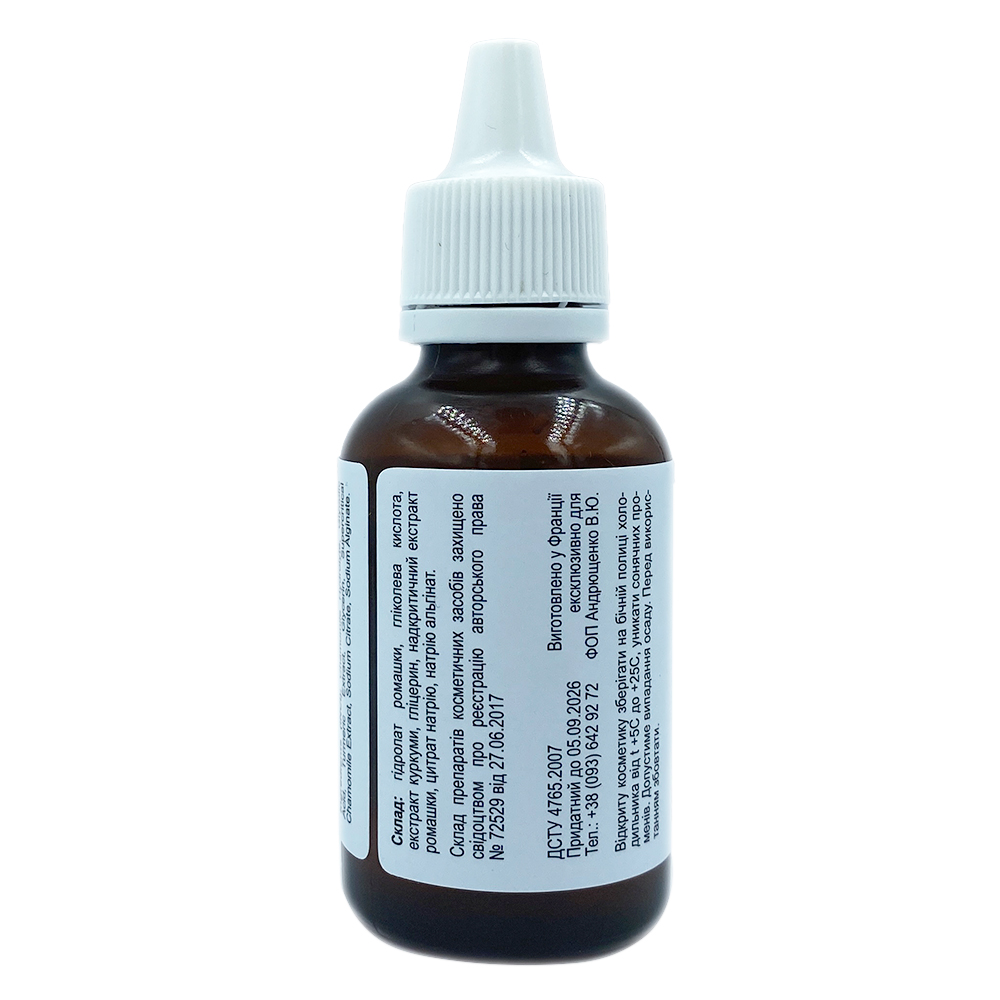 Склад: гідролат ромашки, гліколева кислота, екстракт куркуми, гліцерин, надкритичний CO2 екстракт ромашки,