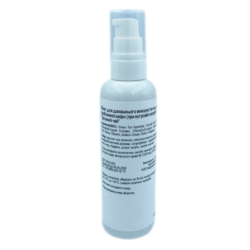 Склад: гідролат зеленого чаю, гліколева кислота, хлорофілово-мідний комплекс кропиви, хлорофілово-мідний комплекс м’яти, мед, гліцерин, цитрат натрію, натрію альгінат.