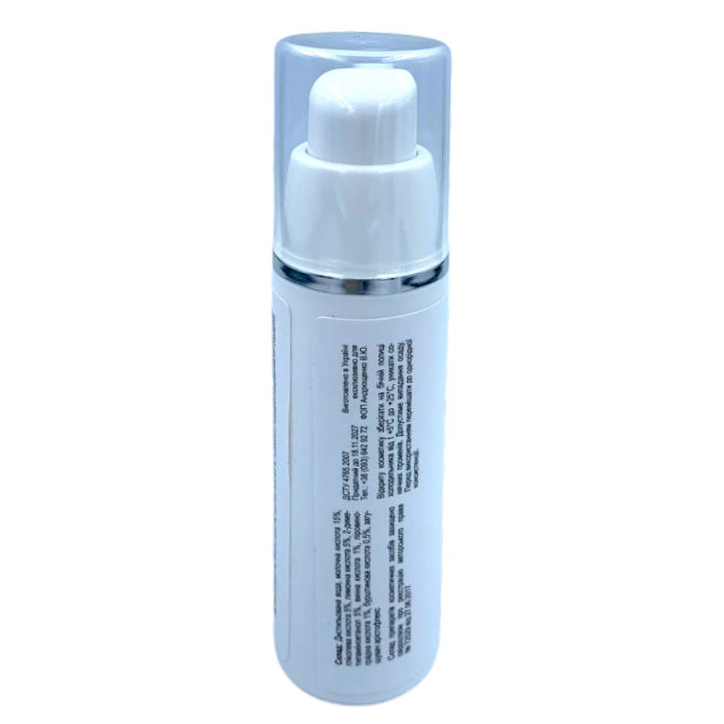 Склад: Вода дистильована, Молочна кислота 15%, Гліколева кислота 5%, Лимонна кислота 5%, Диметиламіноєтанол ДМАЕ 5%, Винна кислота 1%, Піровиноградна кислота 1%, Янтарна кислота 0,5%, Загущувач арістофлекс.