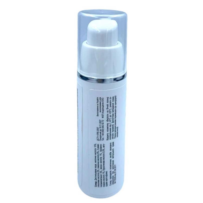 Склад: Вода дистильована, Молочна кислота 15%, Гліколева кислота 5%, Лимонна кислота 5%, Диметиламіноєтанол ДМАЕ 5%, Винна кислота 1%, Піровиноградна кислота 1%, Янтарна кислота 0,5%, Загущувач арістофлекс.
