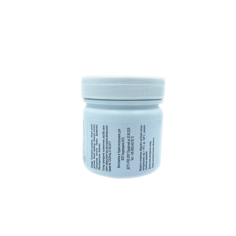 Склад: Тапіоковий крохмаль, натрій кокоілізитеонат, карбонат натрій, лимонна кислота, саліцилова кислота, папаїн, бромелайн, мальтодекстрин, алантоїн