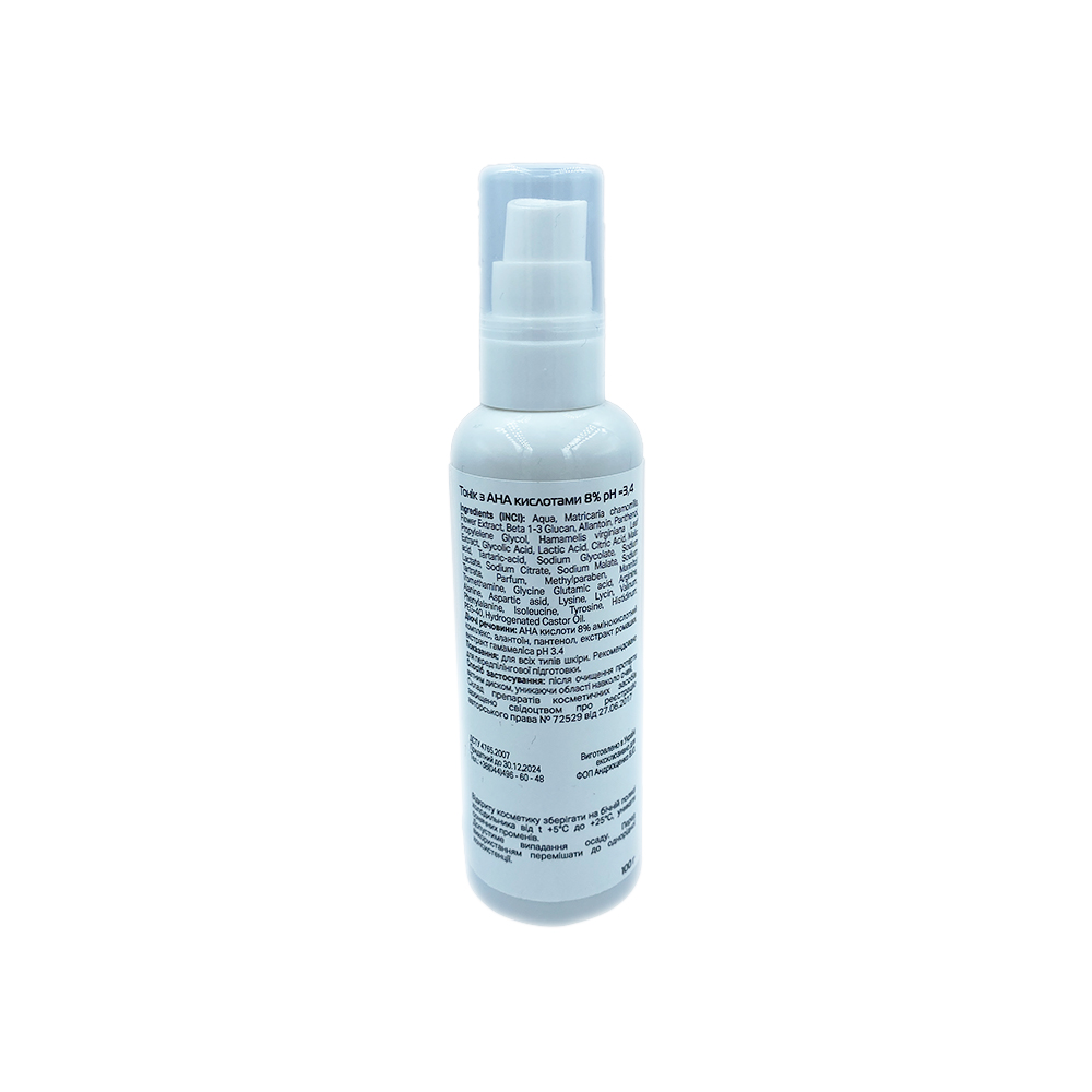 Склад: АНА кислоти 8%, амінокислотний комплекс, алантоїн, пантенол, екстракт ромашки, екстракт гамамелісу, екстракт ромашки.