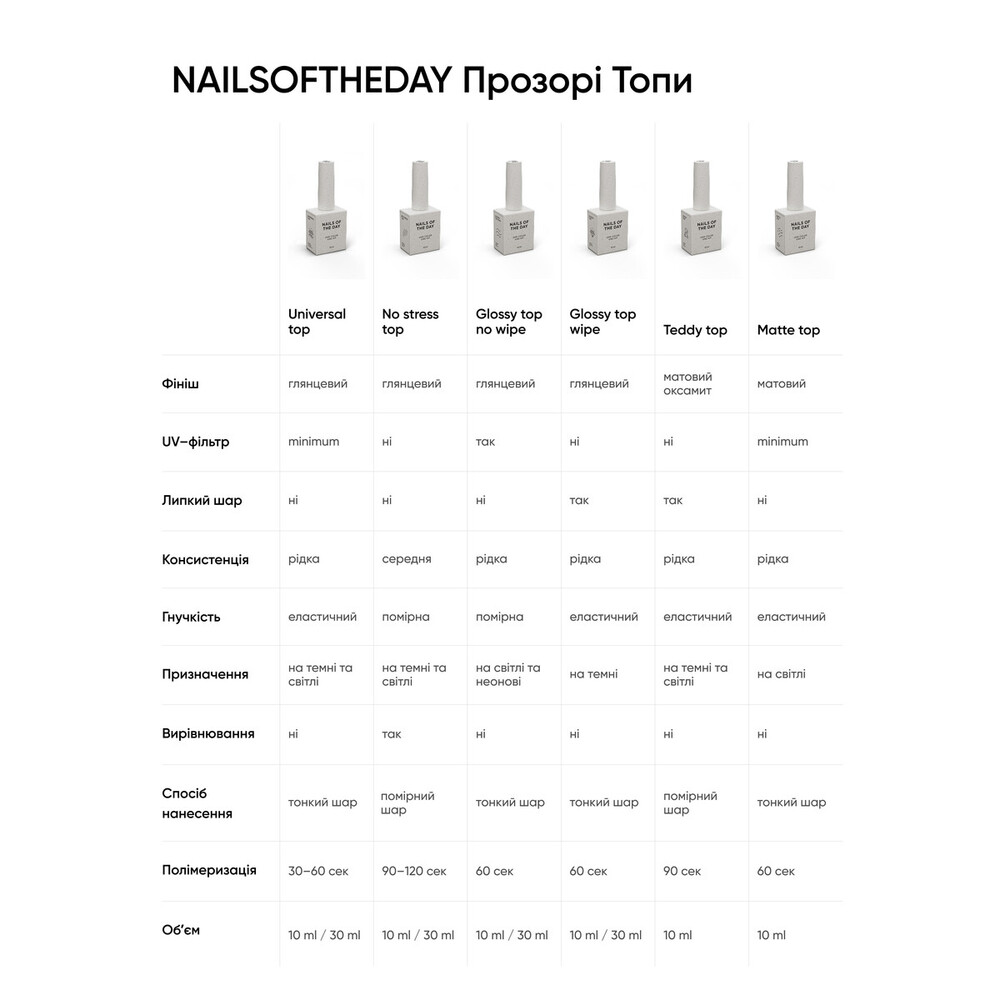 Nailsoftheday Glossy top no wipe – універсальний глянцевий топ без липкого шару та з уф-фільтрами. Його вбудований UV-фільтр надійно захищає покриття від вигорання, зберігаючи яскравість навіть найніжніших тонів. Цей топ стане ідеальним супутником для пастельних і світлих гель-лаків, даруючи їм тривалу свіжість.